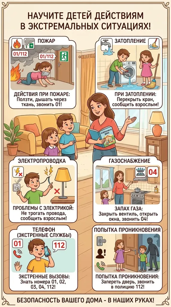 Уметь действовать при пожаре, затоплении, проблемах с электричеством/газом.